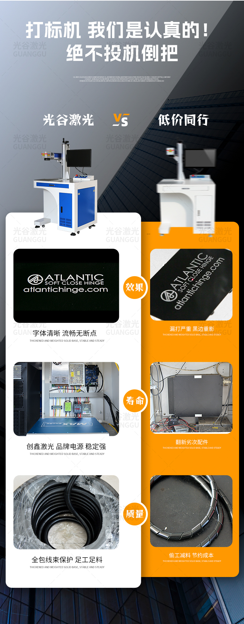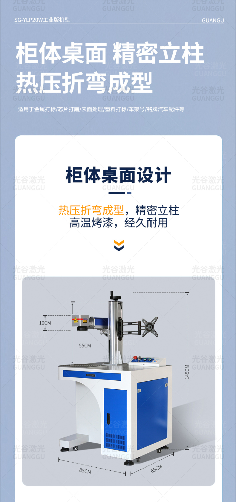 柜式光纖激光打標(biāo)機(jī)的具體適用材料包括各種金屬材料(如不銹鋼、氧化鋁、碳鋼、銅、鐵、鋁、金銀、鋁合金、硬質(zhì)塑料、pvc等材料(塑料材料因成分不同需要)測試實驗)。