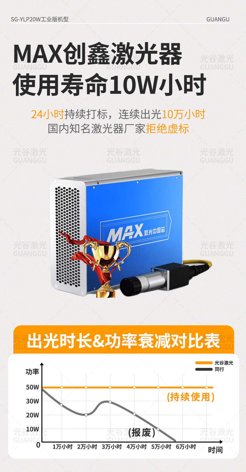 蘇州光谷激光生產(chǎn)的光纖激光打標(biāo)機(jī)的激光器是創(chuàng)鑫激光,其銷量長期位居國內(nèi)前三。創(chuàng)鑫激光是一個有著17年歷史的品牌。產(chǎn)品質(zhì)保2以上保修,可使用時長達(dá)10w小時以上。