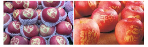 一開始人們用最原始的方法“陽光雕刻”,將字體不干膠貼在蘋果表面,通過蘋果自身的光合作用使遮擋部分顏色變淺,等到果實成熟的時候字體或者圖案就會保存在蘋果上。